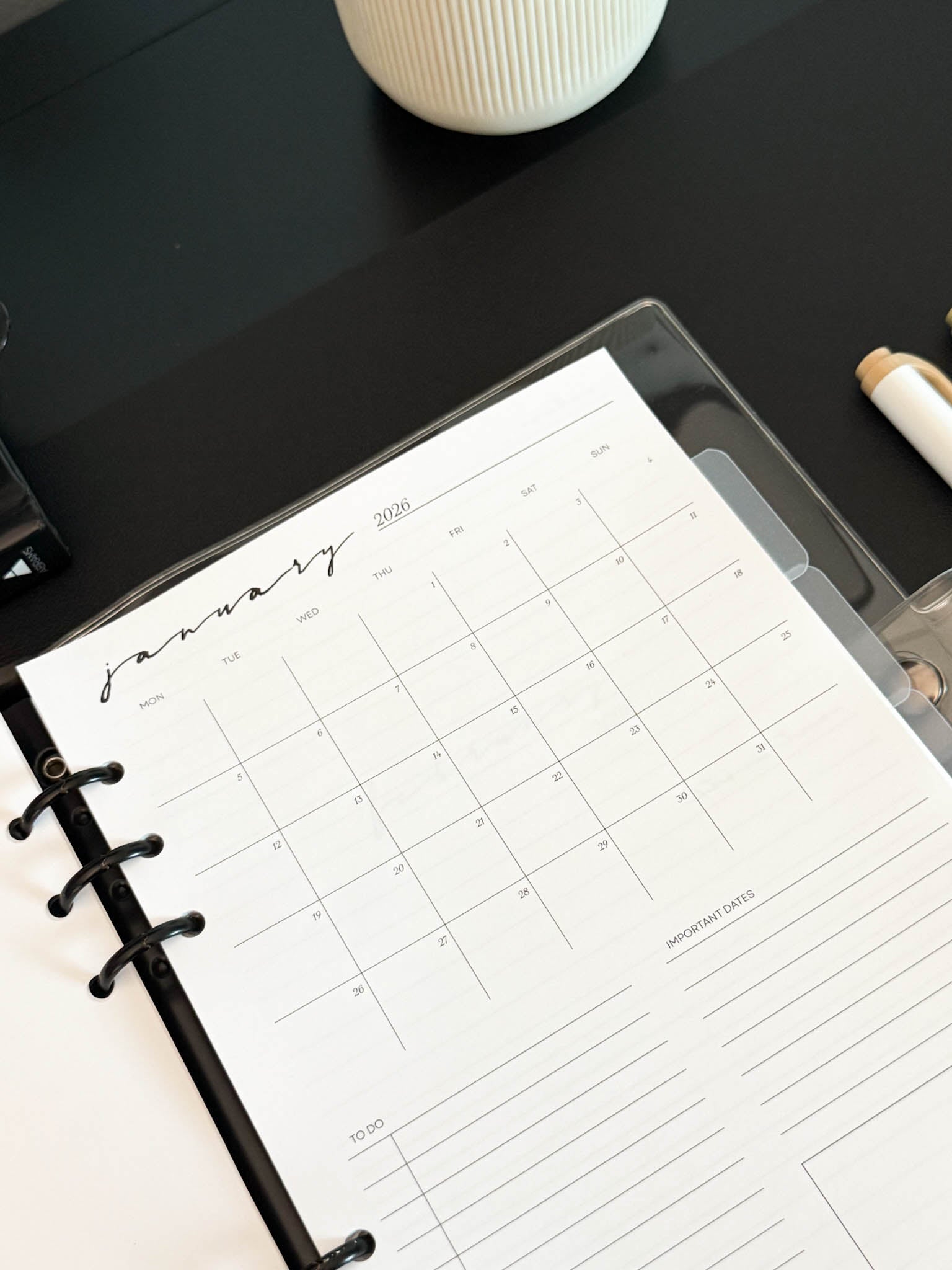 Designed to sit beside your favorite inserts, this one-page layout keeps your month visible while leaving room to plan your way—complete with notes, to-dos, and important dates.