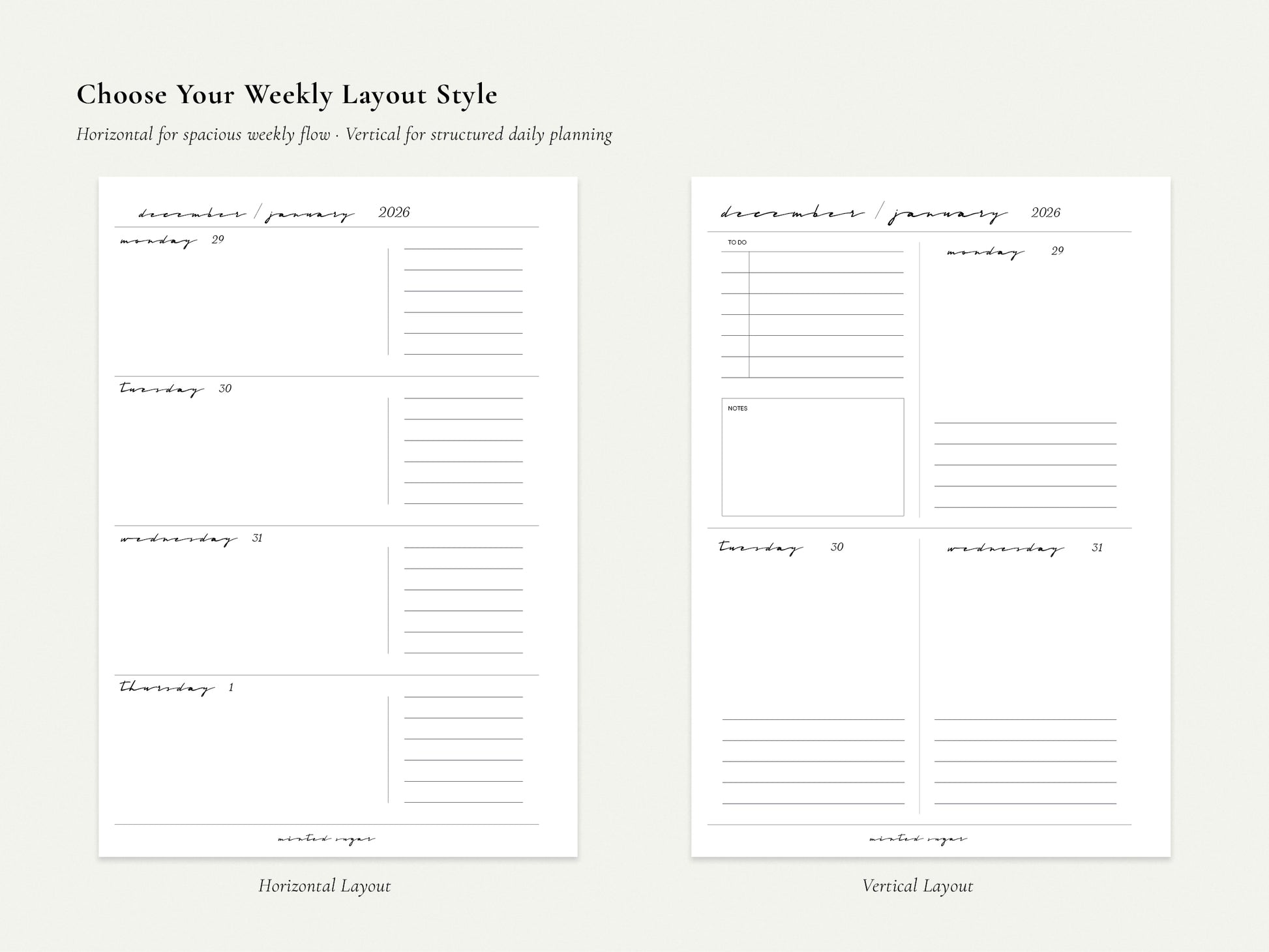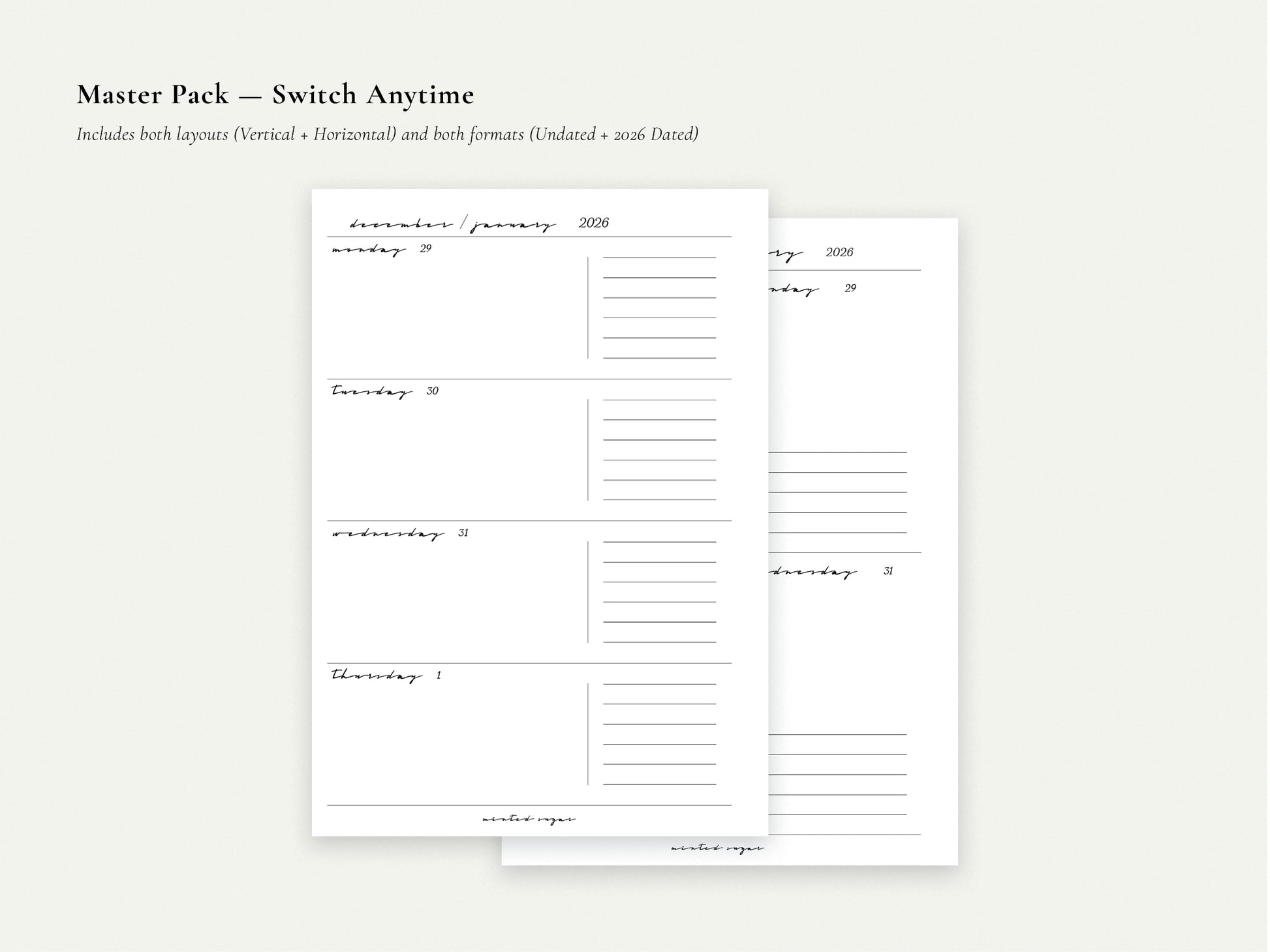 Master Weekly Pack — includes all layouts and formats (Vertical + Horizontal, Undated + 2026 Dated) so you can switch anytime.